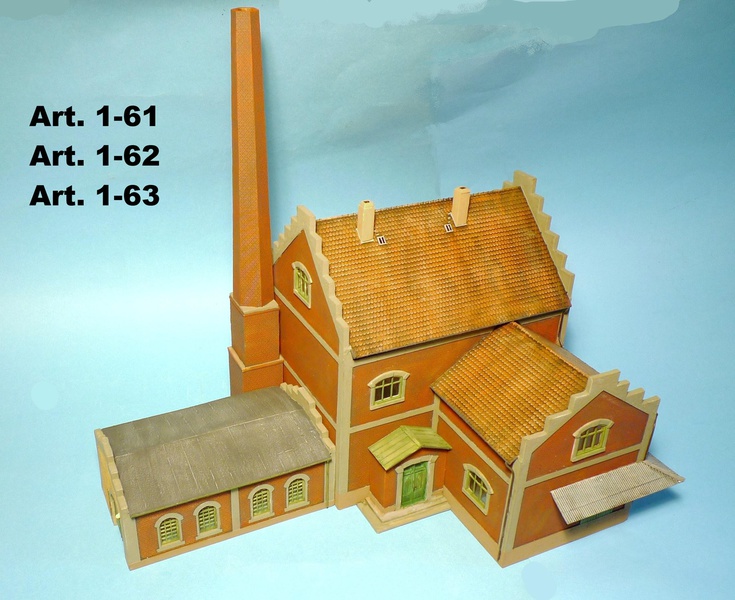 Das Modell kann universell als Fabrikgebäude eingesetzt werden. Das letze Bild zeigt das Modell zusammen mit dem Kesselhaus Art. 1-62 und dem Schornstein Art. 1-63.