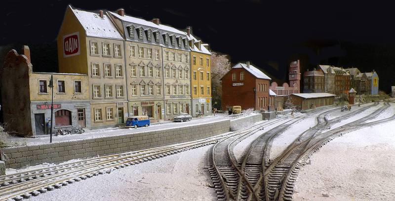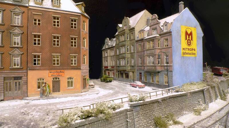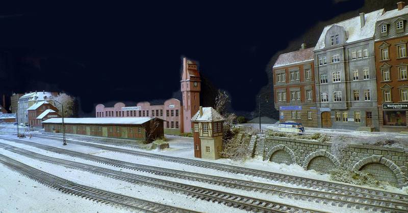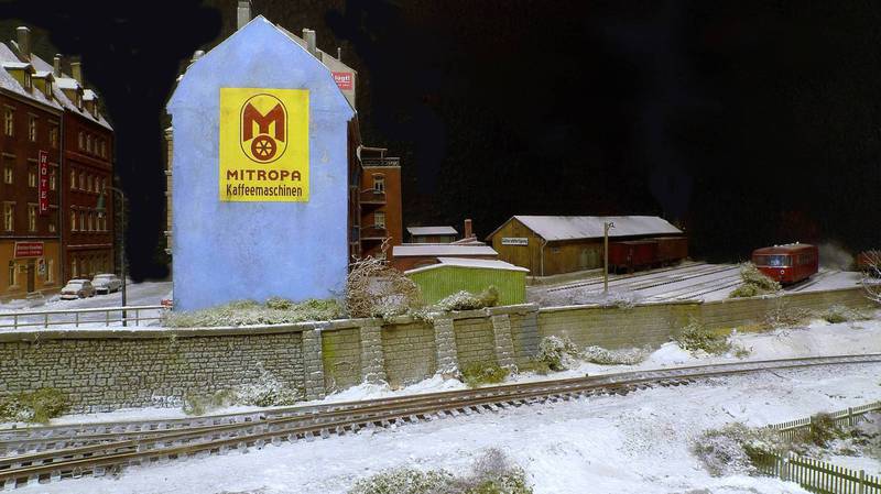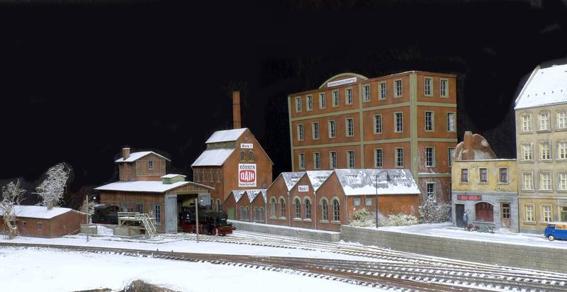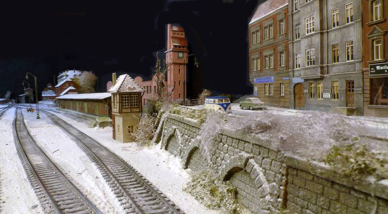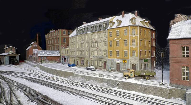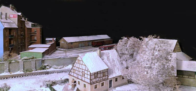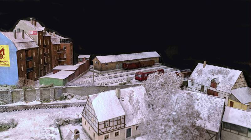 Wie fast alle Städte ist auch Bad Spenzer nicht auf dem Reißbrett entstanden. Um den alten Stadtkern hat sich im Lauf der Zeit ein Speckgürtel gebildet der irgend wann (nach alten Chroniken war es gegen Ende des 19. Jahrhunderts) die umliegenden Dörfer erreicht hat, die dann auch schnell eingemeindet wurden. Das ist der Grund warum selbst heute noch mitten in so mancher Großstadt alte Bauernhäuser stehen, obwohl der nächste Acker kilometerweit entfernt ist. Häufiger kommt es vor, dass leider oft nur noch die mit „Dorf“ endenden Stadtteilnamen daran erinnern, dass hier früher eine von Wiesen und Feldern umsäumte bäuerliche Siedlung stand. Ende 1959 (in dem Jahr „spielt“ meine Anlage) war das noch anders, der Stadtrand und die ausgedehnten Anlagen der Bahn haben das beschauliche Großmöpsach zwar längst erreicht und auch die Eingemeindung ist schon länger her, aber der Ortskern ist noch weitgehend im ursprünglichen Zustand. Kurz vor Weihnachten hat es kräftig geschneit und auch wenn die alten Bauern der ehemaligen Selbständigkeit der Gemeinde immer noch nachtrauern, so hat es doch zumindest den Vorteil dass die Stadt die Straßen nicht nur ausgebaut hat, sondern auch regelmäßig räumt.