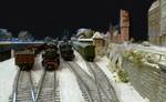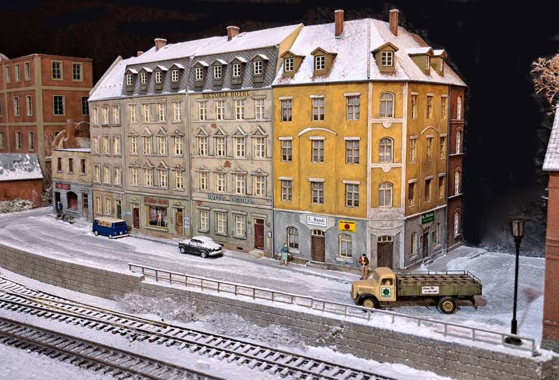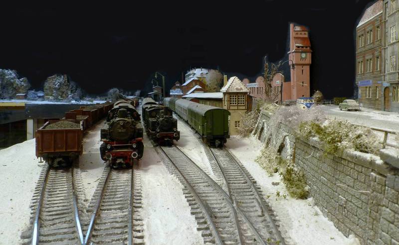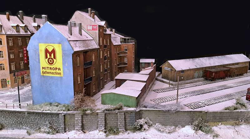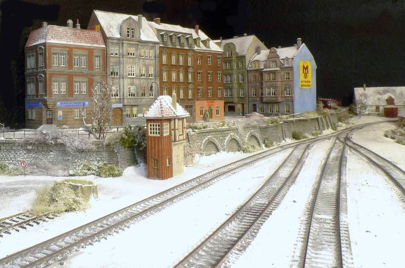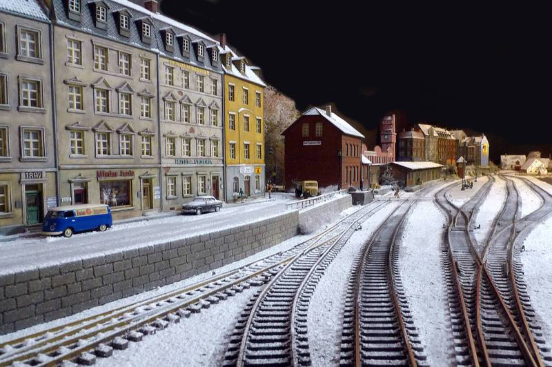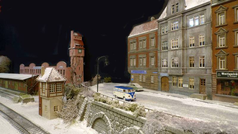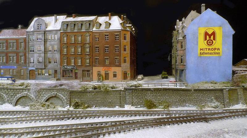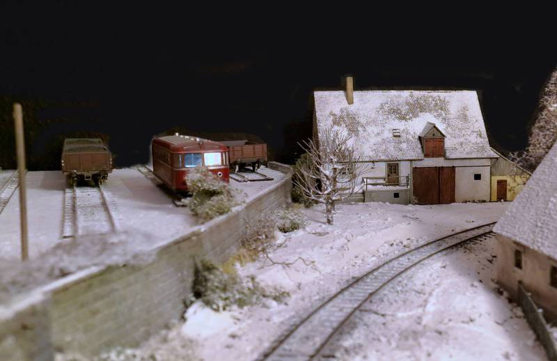 Wie fast alle Städte ist auch Bad Spenzer nicht auf dem Reißbrett entstanden. Um den alten Stadtkern hat sich im Lauf der Zeit ein Speckgürtel gebildet der irgend wann (nach alten Chroniken war es gegen Ende des 19. Jahrhunderts) die umliegenden Dörfer erreicht hat, die dann auch schnell eingemeindet wurden. Das ist der Grund warum selbst heute noch mitten in so mancher Großstadt alte Bauernhäuser stehen, obwohl der nächste Acker kilometerweit entfernt ist. Häufiger kommt es vor, dass leider oft nur noch die mit „Dorf“ endenden Stadtteilnamen daran erinnern, dass hier früher eine von Wiesen und Feldern umsäumte bäuerliche Siedlung stand. Ende 1959 (in dem Jahr „spielt“ meine Anlage) war das noch anders, der Stadtrand und die ausgedehnten Anlagen der Bahn haben das beschauliche Großmöpsach zwar längst erreicht und auch die Eingemeindung ist schon länger her, aber der Ortskern ist noch weitgehend im ursprünglichen Zustand. Kurz vor Weihnachten hat es kräftig geschneit und auch wenn die alten Bauern der ehemaligen Selbständigkeit der Gemeinde immer noch nachtrauern, so hat es doch zumindest den Vorteil dass die Stadt die Straßen nicht nur ausgebaut hat, sondern auch regelmäßig räumt.
