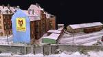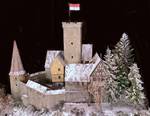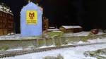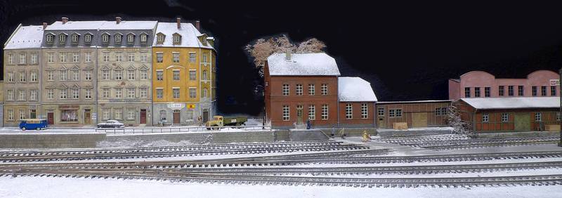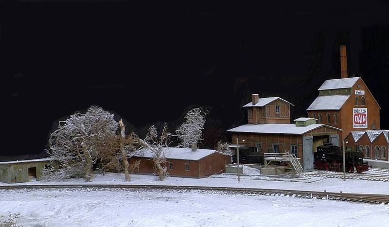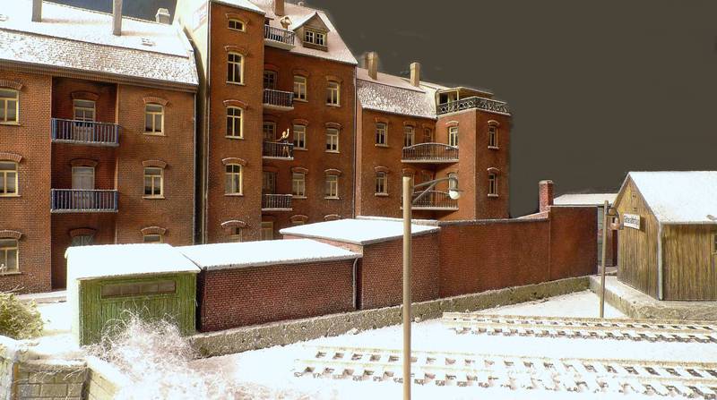 Bevor nun Frau Holle ihren Dienst verrichten darf, noch ein paar Worte zum Hintergrund. Bei meinen früheren Anlagen war die jeweils individuell gestaltete Hintergrundkulisse ein wesentlicher Bestandteil der realistischen Wirkung. Leider konnte ich keine überzeugende Kulisse mit verschneiter Landschaft auftreiben. Ich habe deshalb auf eine Kulisse komplett verzichtet und die Wände wie bei meinen Winterdioramen schwarz gestrichen. Das mag jetzt paradox erscheinen, vermittelt meiner Meinung nach aber eine bessere Winterstimmung als blauer Wolkenhimmel.